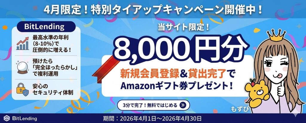 なんと、こちらからBitlendingへの新規登録&貸出完了で【Amazonギフト券8,000円分】がもらえる!