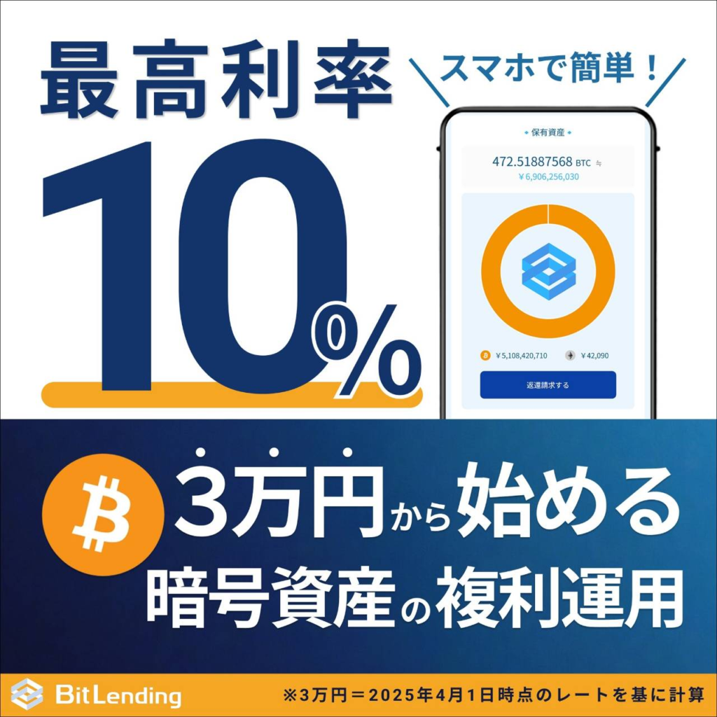 もしそのままにしているなら、非常にもったいないです!実は今、持っている暗号資産を預けるだけで増やせる「BitLending(ビットレンディング)」にて、当サイト限定の超特大キャンペーンがスタートしました。
