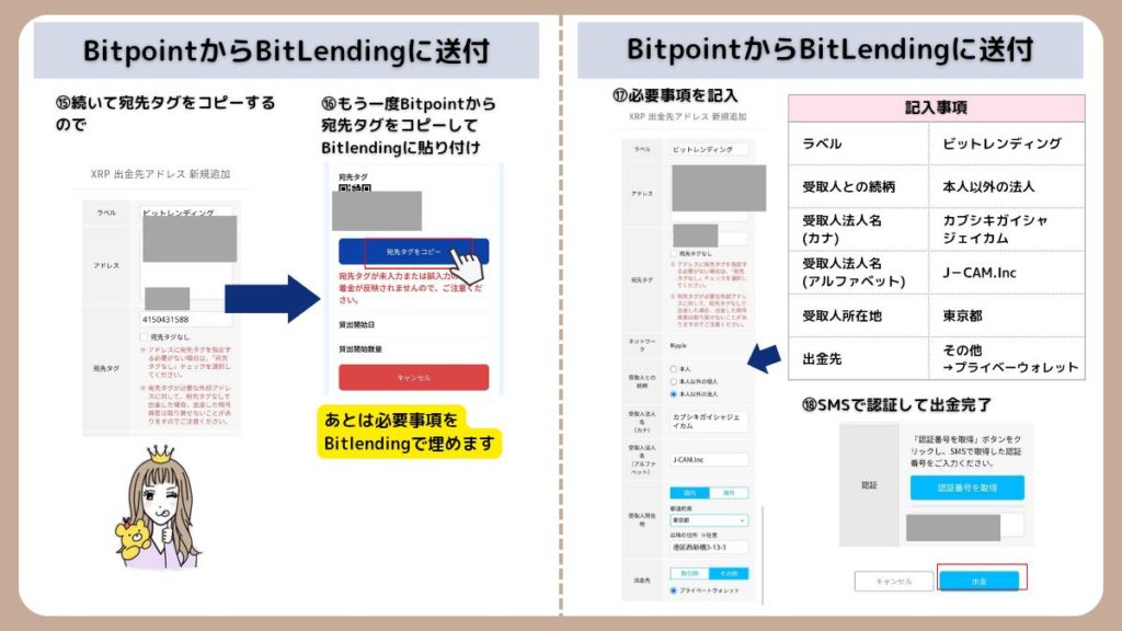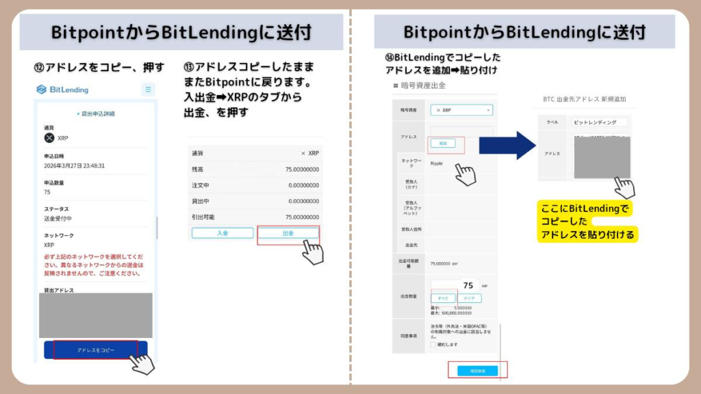 BitLendingの画面でXRPの「入金アドレス」を発行し、BITPOINTの送金画面に貼り付けます。