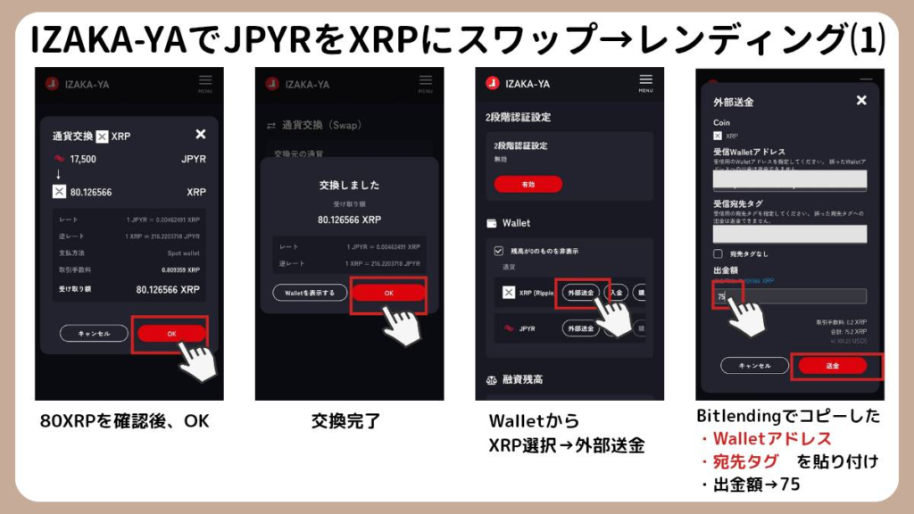IZAKA-YAのプラットフォーム上で、手持ちのJPYR(2万円分)のうち、BitLendingの貸出に必要な「75XRP」分をスワップ(交換)します。ここでも手数料分を考慮して少し多めにスワップしておきましょう。 - IZAKA-YAからBitLendingへXRPを送金する