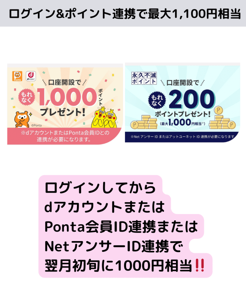 ポイント連携で1000円相当+アプリ口座開設で100円相当