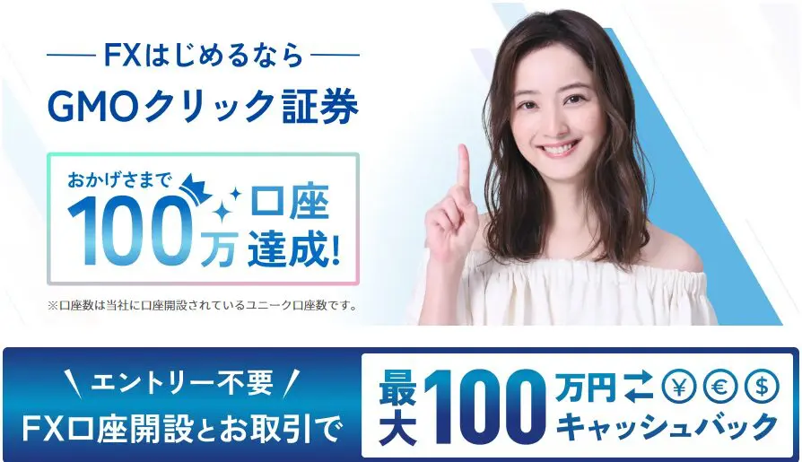 GMOクリック証券の「はじめてのFX口座開設とお取引で最大100万円キャッシュバック」は、エントリー不要で取引量に応じた高額報酬が魅力のキャンペーンです。