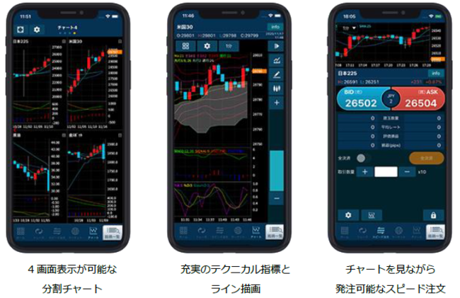 スマホアプリ「GMOクリック 株」や「GMOクリック FXneo」は、直感的な操作でチャート分析や注文が可能。