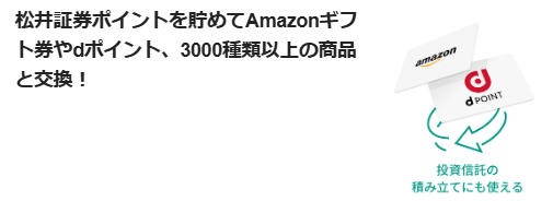 - サービス内容:投資信託の月間平均保有残高に応じて、松井証券ポイントが毎月付与される。ポイントは投資信託の買付やdポイント、Amazonギフトカードなど3,000種類以上の商品に交換可能。