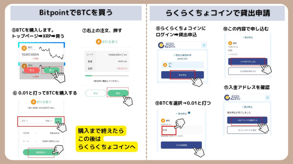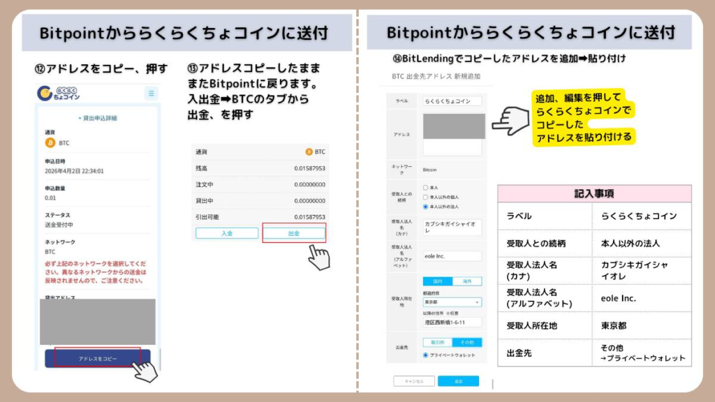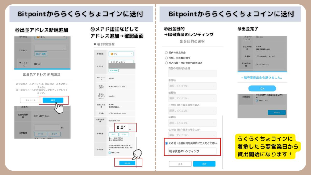 【図解】BTCをらくらくちょコインへ送金して貸し出す手順