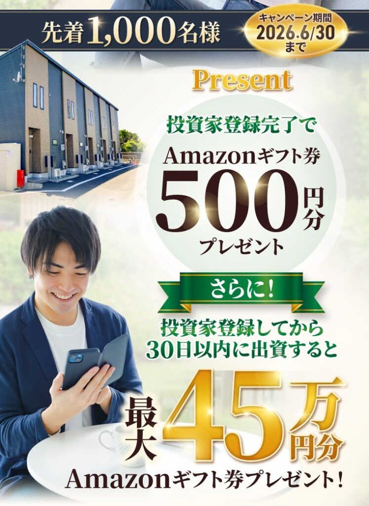 今すぐ登録でAmazonギフト券500円+出資で最大45万円相当がもらえる!