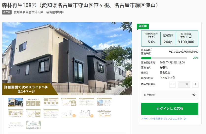 現在の応募状況(取得時点):1,730万円 / 7,550万円(約22%)
